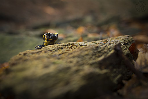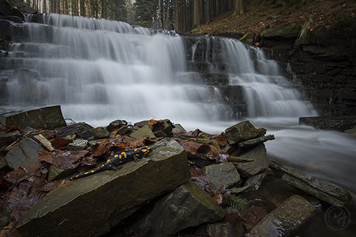 Došli jsme k malým vodopádkům a rozdělali vercajk, že si nafotíme rozpuštěné vlasy tekoucího potoka. Jenže já najednou uviděl na kamínku malinkého mloka. Tak malého jsem ještě neviděl, měl snad 4cm, takové mločí mimčo. Měl jsem nasazenou širokou 20mm, nachystanou na potok, tak už jsem ji tam nechal a začal rychle fotit, než mločík zmizí z kamene pod listí. Tihise jsem nechal máchat v potoku a vydal se podél potoka výše. Narazil jsem ještě na tři kousky, ale už samé velké jedince. Ti byli ještě asi ztuhlí, protože vytrvale seděli na místě a nechali se fotit. Hlavně jedne kousek na kameni pod vodopádkem.